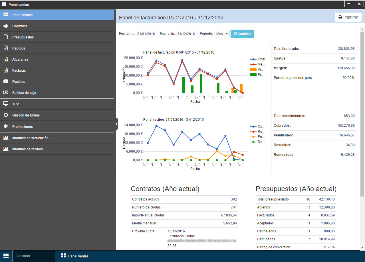 - Vendes: pressupostos, contractes, albarans, factures, cartera de rebuts, sortides de caixa, etc.